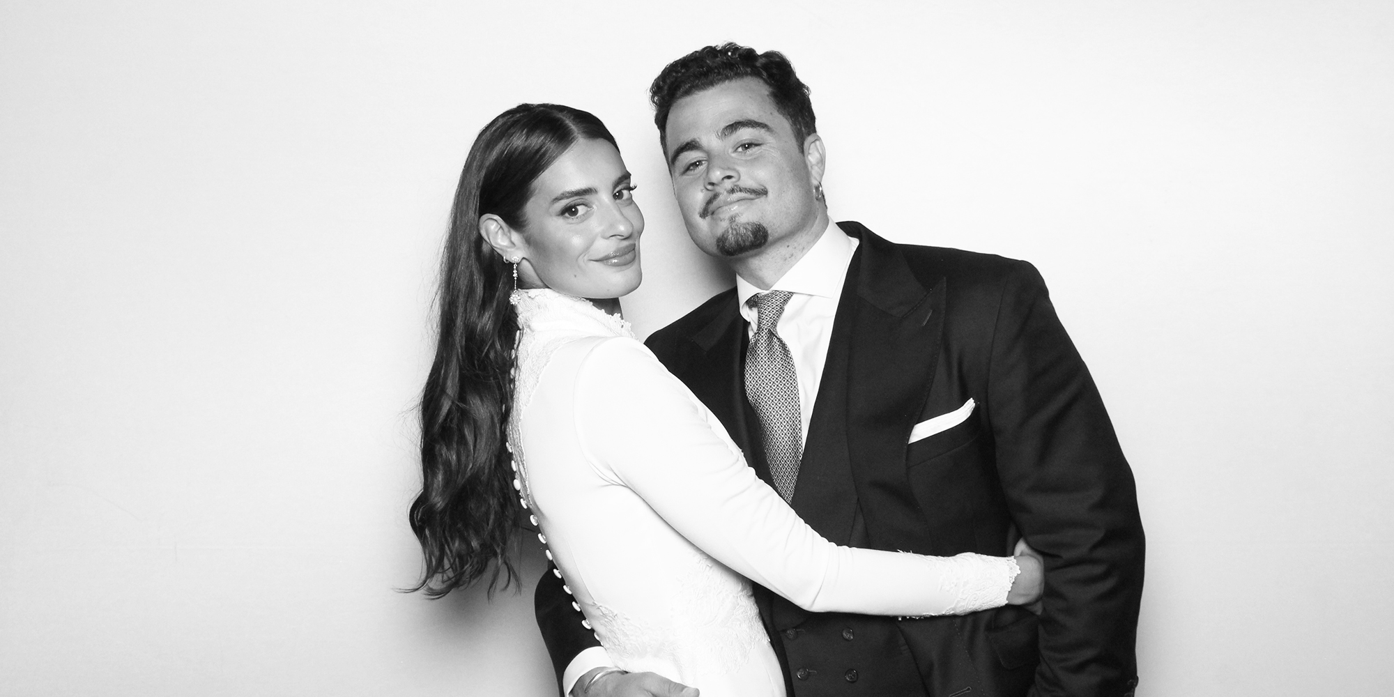 Para elevar la experiencia de la fiesta, Esfering Photobooth instaló uno de sus exclusivos fotomatones de diseño. Lejos del típico photocall, se creó un set de estilo estudio donde los invitados podían posar con iluminación profesional entre baile y baile. El resultado fue una colección de imágenes en blanco y negro de alta calidad (estilo Kardashian) que los novios se llevaron recopiladas en un álbum de lujo, el recuerdo tangible perfecto de una noche inolvidable.
